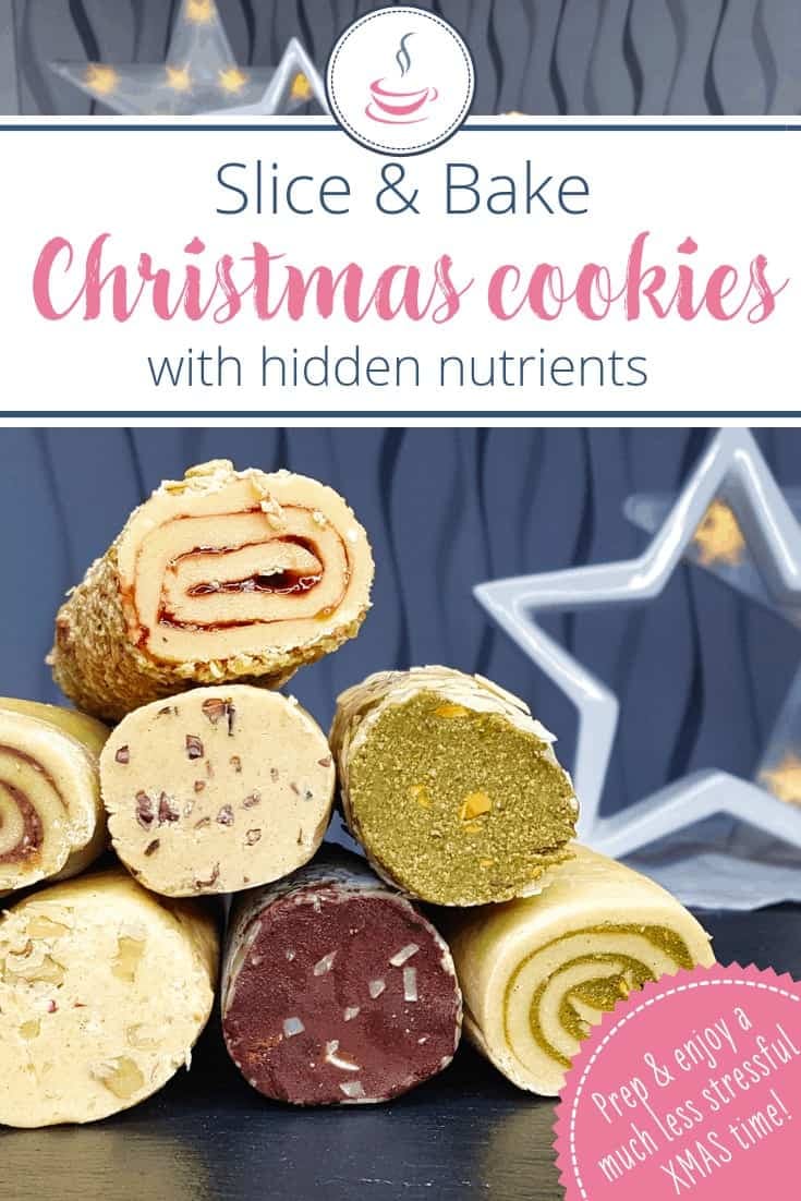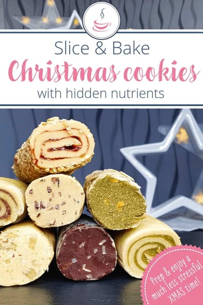 If you’re looking for healthier homemade slice & bake cookies, you’ll want to give these a shot. Not only are they a crumbly soft delight with your afternoon coffee, they are also versatile and contain hidden extra nutrients. I’ll show you how to do this!